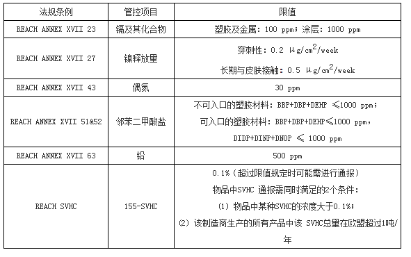 Reach regulation name is the regulation on registration, assessment, licensing and restriction of chemicals, which includes four parts: registration, evaluation, authorization and restriction. From June 1, 2009, the former EU directive 76/769/eec was replaced by reach appendix 17. Currently, annex 17 to reach of the EU regulation contains 64 categories of substances. For accessories, the control substances in reach appendix 17 are mainly lead, cadmium, nickel release and phthalate. Among them, the lead articles of jewelry are article 63 of annex XVII issued by the European Commission in its official gazette on September 19, 2012, and has been officially effective on October 9, 2012. In addition, the number of substances of high concern (SVHC) that meet the requirements of reach Article 57 has been increased to 169.